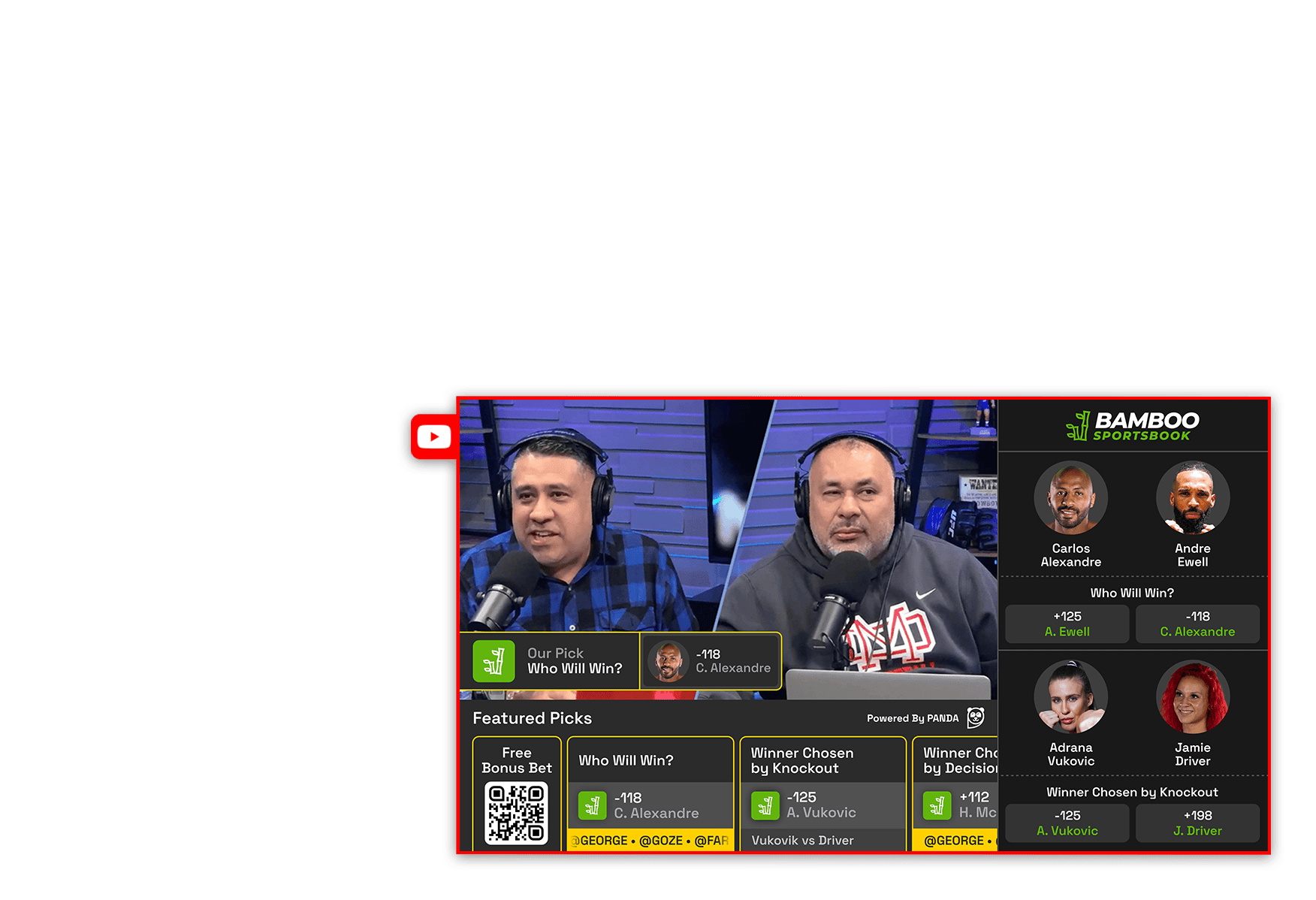 More than just sports betting, PANDA lets you add live chat, curated social content, and even clickable on-air graphics to your streams. The result? Lean-in viewing experiences that keep viewers engaged and coming back for more.